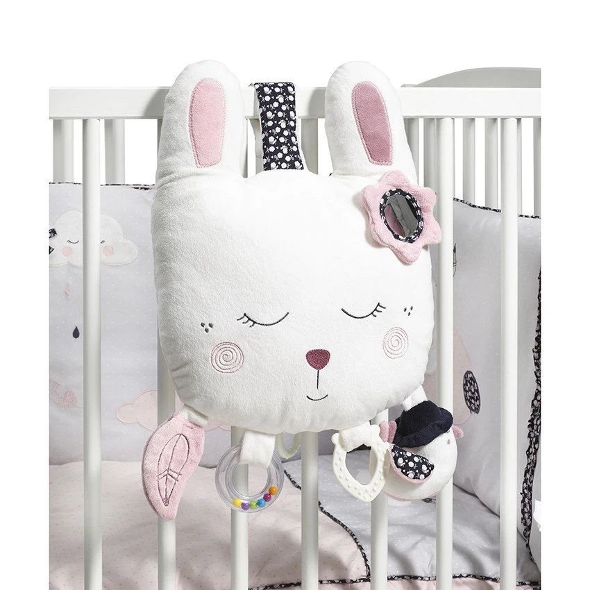 De taille facilement transportable, il peut s’attacher aussi bien aux barreaux du lit qu’au siège de la voiture ou qu’à la poussette. Où qu’il soit, votre bébé pourra ainsi attraper, toucher, entendre de la musique. Son attention sera toujours en éveil.