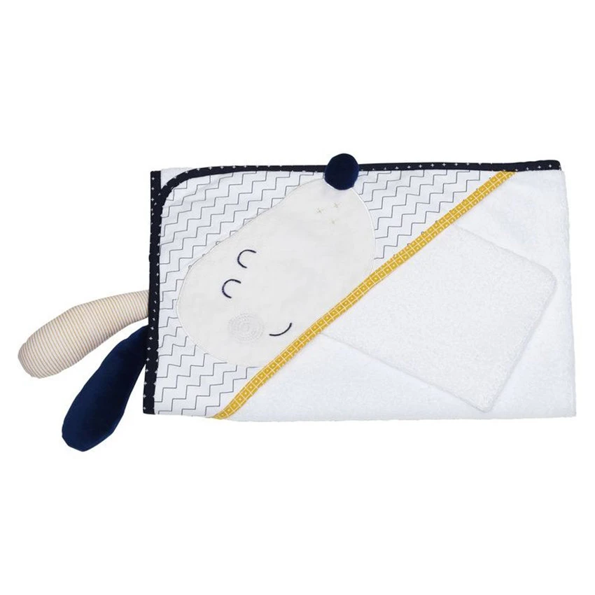 Idéal pour un cadeau de naissance, cette jolie parure de bain Hello en blanc et bleu-marine accueillera et réchauffera bébé à la sortie du bain ! Gant inclus.