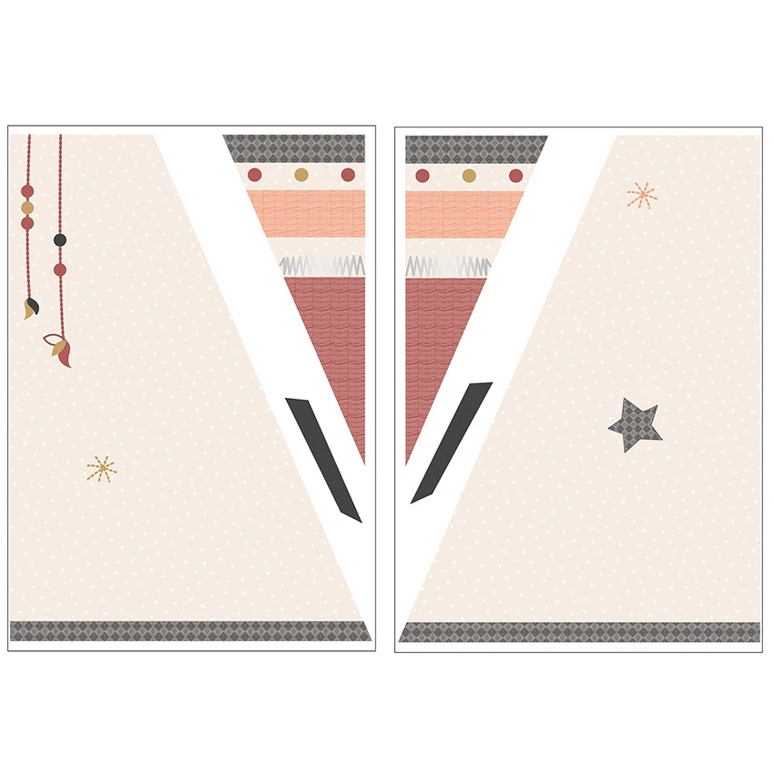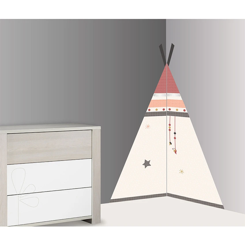 Le tipi se reconstitue au moyen de deux stickers, ce qui permet de le coller sur un mur plat ou dans le coin d’une chambre.